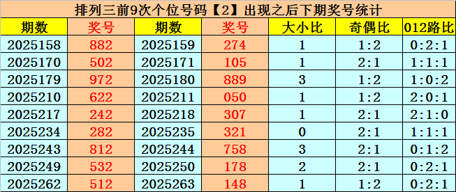 个位号码:上期奖号为小 号、偶数、2路号码:2,历史上个位号码2共开出729期,前一次出现在第2025262期,上期遗漏1期再出。