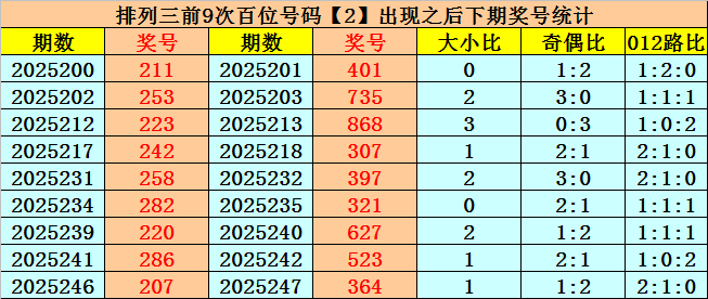 百位号码:百位上期奖号为0路、偶数、小 号:2,历史上百位号码2共开出737期,前一次开出期数在第2025246期,上期奖号隔17期再次开出。