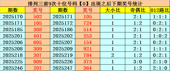 十位号码:十位上期开出偶数、小 号、0路号码:0,历史上十位号码0共开出718期,上一次出现在第2025246期,上期奖号遗漏值为17期。